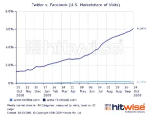 Now, new data from the web intelligence company, Hitwise, suggests that Facebook is simply overpowering Twitter. Indeed, Twitter’s initial growth appears to be falling. Over the past year, according to Hitwise, Facebook has trebled its market share of visits. Whereas, Twitter hasn’t grown; indeed, Hitwise shows that Twitter has actually fallen from a market share of 0.2% to one of 0.14%.