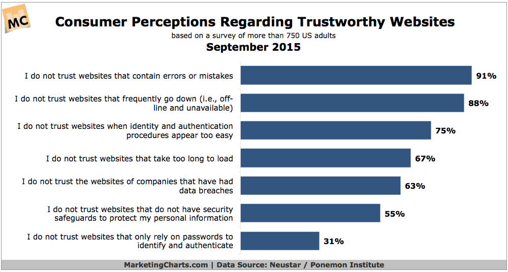 The study found that other issues that cause lack of trust are poor availability of a website or a site that takes too long to load. Security concerns were much less important to people than these practical concerns.