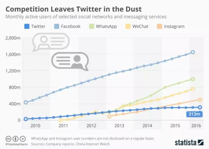 Facebook continues to grow, now having more than 1.7bn active users each month, whereas Twitter can only manage 313m regular users – less than one-fifth the amount of people using Facebook.