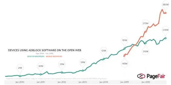 According to a study by Pagefair, the amount of ad blocking has increased by over 1000% in the past five years.